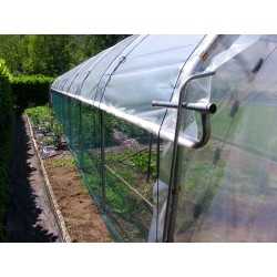Cette grande serre de jardin est munie de filets anti-grêle à double trame de couleur vert. Fixée à même le sol, elle peut accueillir des cultures en pleine terre.
