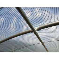Pour son maintien, la structure des tubes est en acier galvanisé de diamètre 40. La serre maraichère est abritée d'une bâche en polyéthylène Thermolux de 200 à 230 microns, avec une ouverture de porte latérale de 0.75 m de large sur une hauteur de 1.85 m et 2 ouvertures latérales enroulables par manivelles.